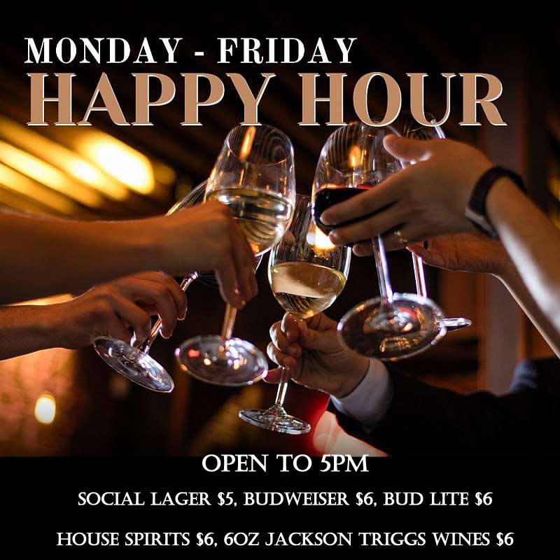 9oz wine for 6oz price, 50% off all wine bottles, and 25% off all appetizers!