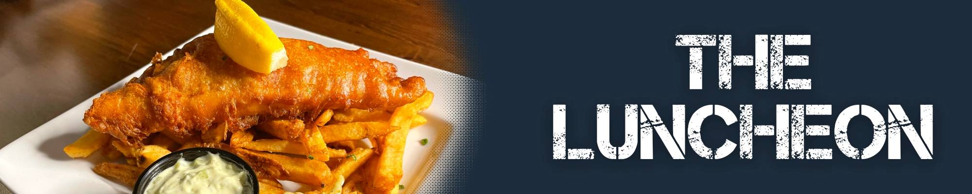Beer battered haddock served inside newspaper cones with French fries, tartar sauce & lemon