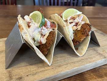 white corn tortilla, panko fried haddock, creamy brussel & napa slaw, chipotle baja sauce, pico, avocado, lime, cilantro