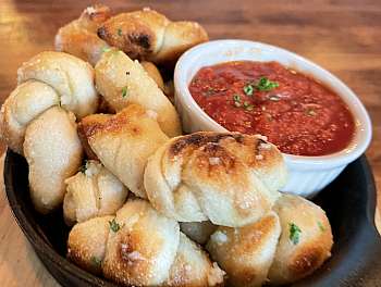 hand-tied 00 flour pizza dough knots, oven-baked with garlic butter, parmesan, and herbs. Served with house pizza sauce for dipping