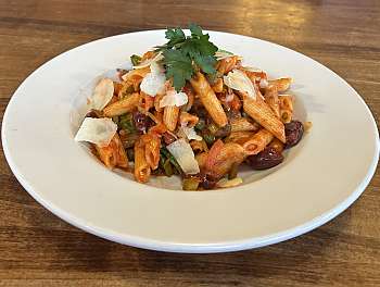 sweet peppers, roasted garlic, capers and kalamata olives combined with our signature tomato sauce tossed in penne pasta & served with garlic toast