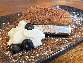 Coffee soaked ladyfingers layered with whipped cream cheese & finished with a cocoa dusting