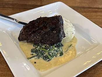 AAA charbroiled skirt steak marinated in a harissa blend, served with truffle whipped potatoes & creamed spinach