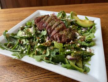 Arugula, avocado, asparagus, red onion, goat cheese and pumpkin seeds topped with a flat iron steak with our house made chimichurri vinaigrette 29.95