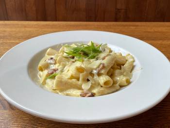 Rigatoni tossed in a traditional carbonara sauce, bacon and