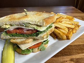 Butter toasted sourdough bread layered with roasted garlic aioli, avocados, tomatoes, iceberg lettuce & Swiss cheese 17.95
