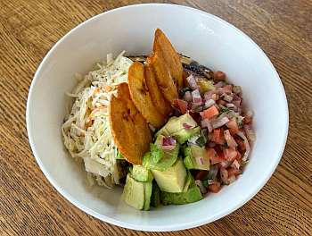 Crispy fried plantain chips, pico de gallo, creamy slaw, avocado,
