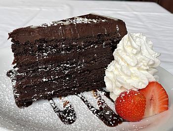 Four layers of decadent chocolate cake separated by chocolate fudge icing. Finished with a dark & white chocolate glaze 10.95