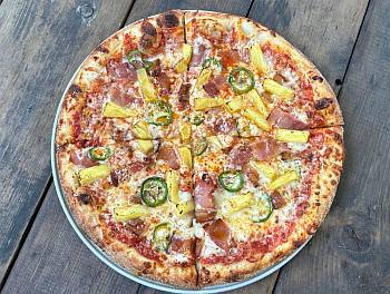 House pizza sauce, mozzarella, pineapple, jalapenos, smoked bacon, finished with mike's hot honey. Sweet, spicy, and a little rebellious 21.95