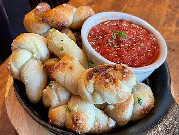 Hand-tied 00 flour pizza dough knots, oven-baked with garlic butter, parmesan, and herbs. Served with house pizza sauce for dipping 12.95