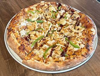 Chipotle BBQ sauce, mozzarella, cheddar, herb & garlic chicken, green pepper, crispy onion straws. Smoky, cheesy, with a little crunch 23.95