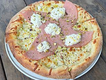 Garlic alfredo sauce, mozzarella, mortadella, ricotta, zesty lemon, pistachio crumble. Bright, creamy, and a little nutty 27.95