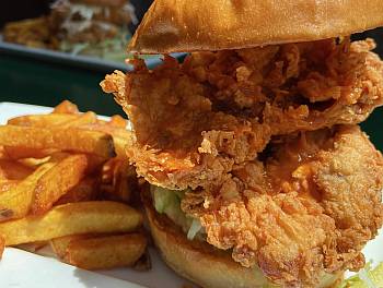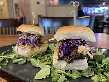 A pair of soft potato buns topped with slow roasted jerk chicken, red cabbage & apple slaw & crispy fried onion straws 14.95