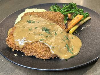 Panko breaded pork cutlet, finished with a Dijon sauce, and served with creamy Yukon Gold mashed potatoes & sauteed seasonal vegetables 24.95