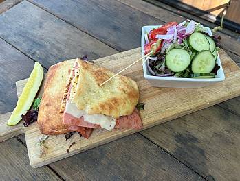 Shaved rib-eye steak, cremini mushrooms, red onions, Swiss cheese and roasted garlic aioli on a garlic toasted panini bun 23.95