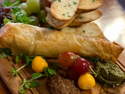 Phyllo pastry baked brie cheese served with red pepper jelly, basil brushed crostinis, roasted garlic, pesto & fresh fruit 21.95