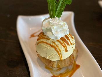Chudleigh's famous cinnamon & oat apple blossom oven baked and finished with our house made caramel sauce and vanilla ice cream 8.95