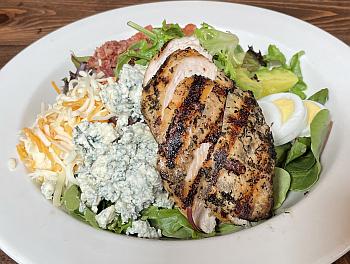 Baby greens, chicken, hard-boiled egg, bacon, Cheddar, Mozzarella and Blue cheeses, tomatoes and avocado. Served with your choice of house made dressing 23.95