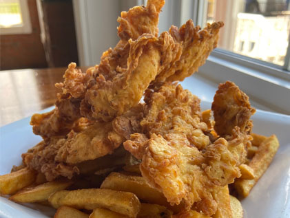 Buttermilk marinated double breaded chicken tenders served over fresh cut fries with plum sauce 20.95