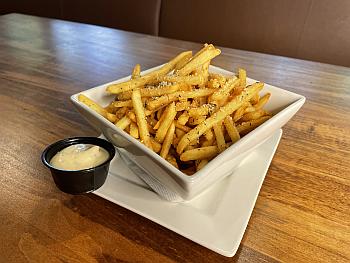 Crispy thin cut potatoes tossed with fresh herbs, garlic & parmesan, drizzled with truffle oil and served with roasted garlic aioli 12.95