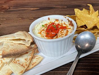 A blend of baby spinach with roasted red peppers and cream cheese, baked with Cheddar & Mozzarella cheeses. Served with flatbread and corn chipss 18.95