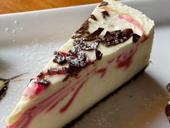 Vanilla cheesecake marbled with strawberry and baked atop a chocolate cookie graham crust. Topped with a champagne mousse, strawberry swirls and dark chocolate shavings 10.95
